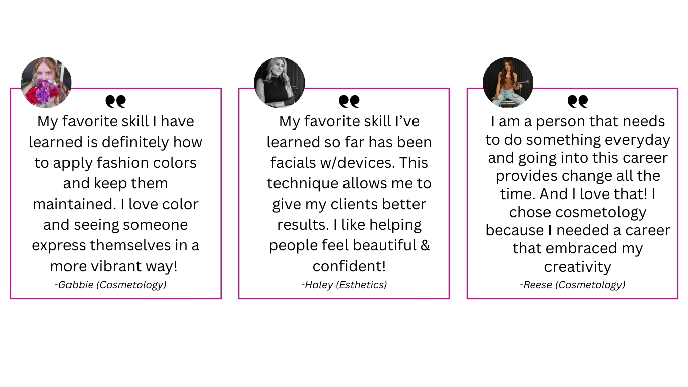 Get in touch with us. Spots are filling quick (Esthetics is almost on a wait list)